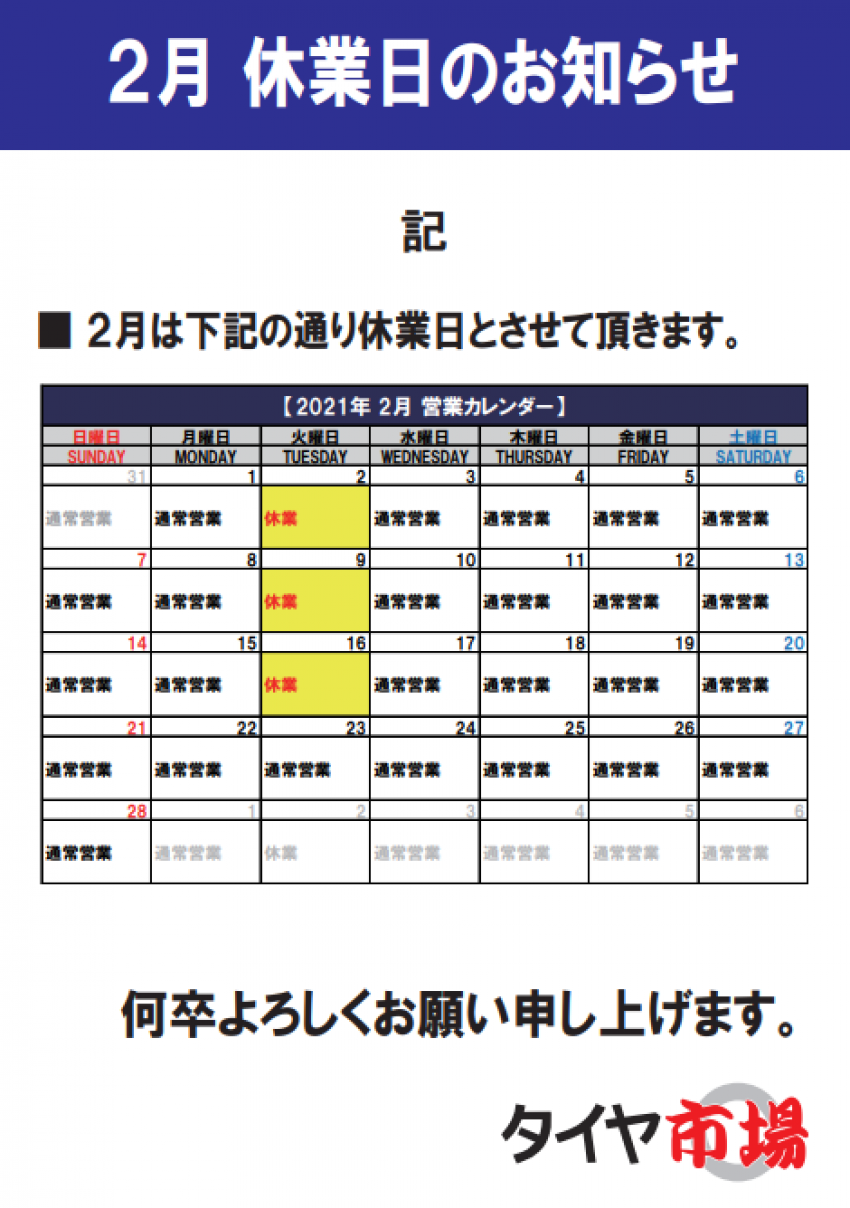 2月の店休日のお知らせです