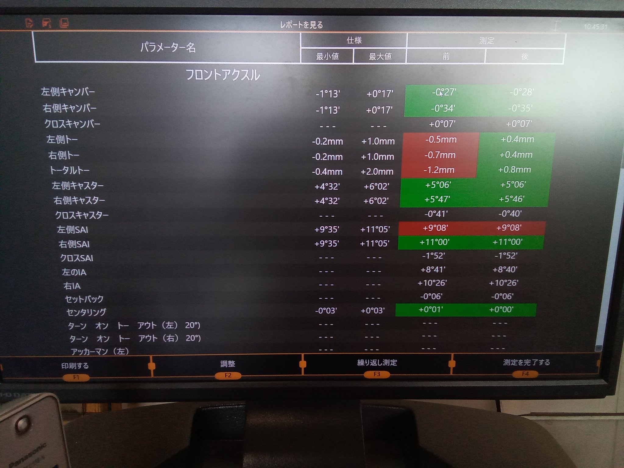 フロント左のトーが0.5mmトーアウト、フロント右のトーが0.7mmトーアウト