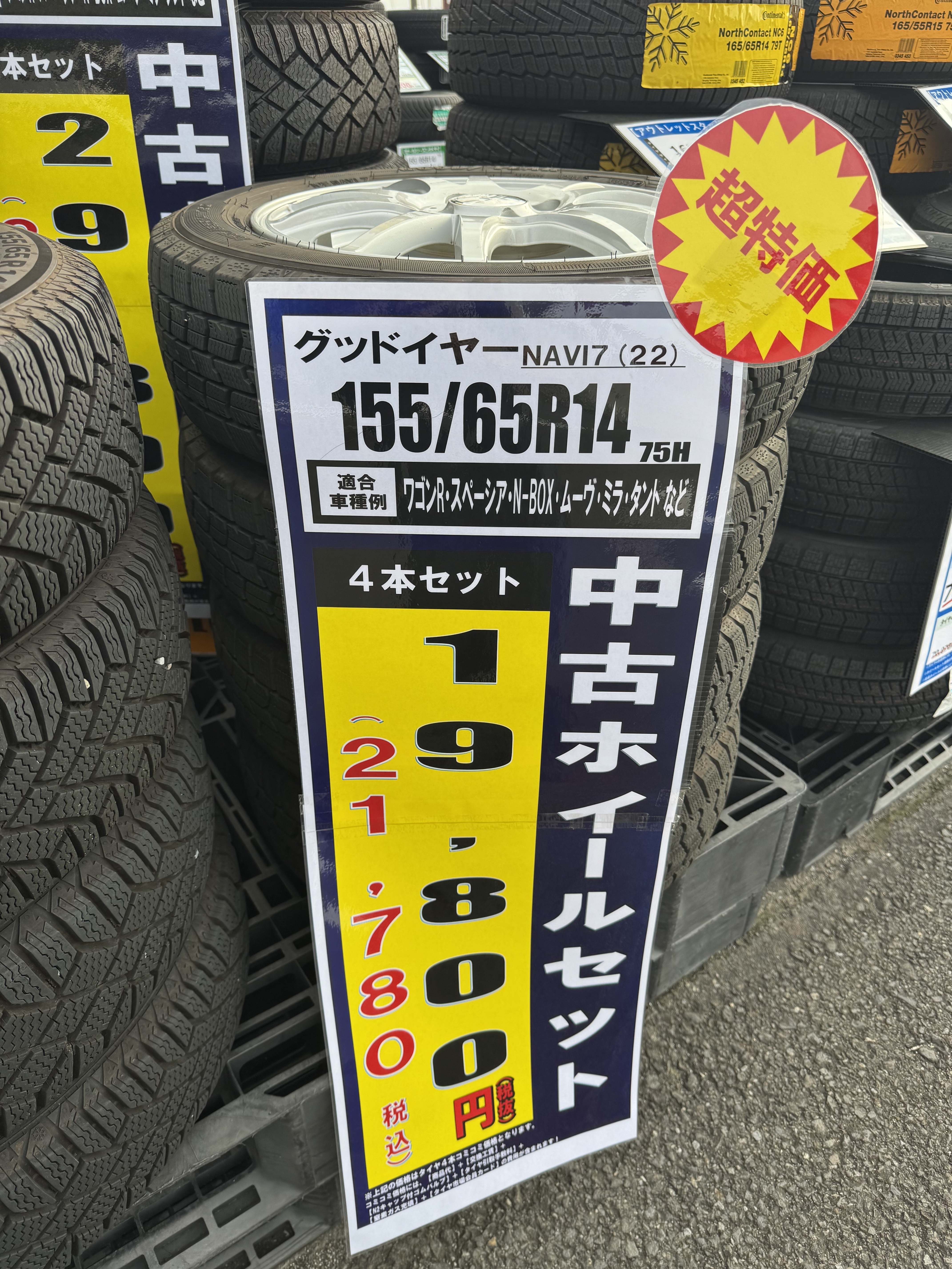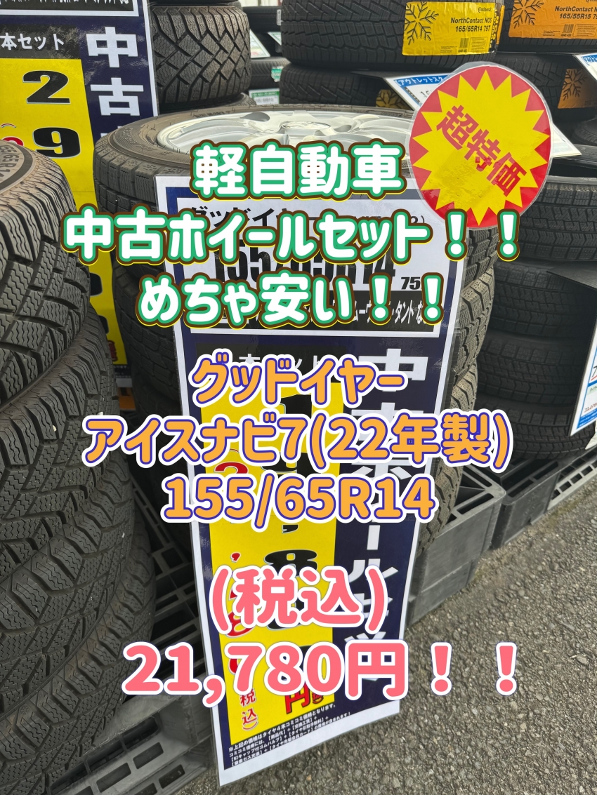 【激安中古ホイールセットあります!!】タイヤ市場足利店では、軽自動車サイズの155/65R14で中古ホイールセットを展開中!!足利以外にも太田・桐生・邑楽エリアにお住いの方、その他の地域にお住いの方も是非!