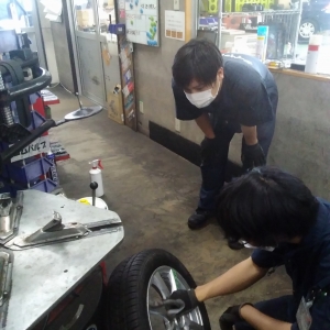 新人が先輩からタイヤの組み込みを教えて貰っている所をパシャリ!!タイヤ屋さんな...