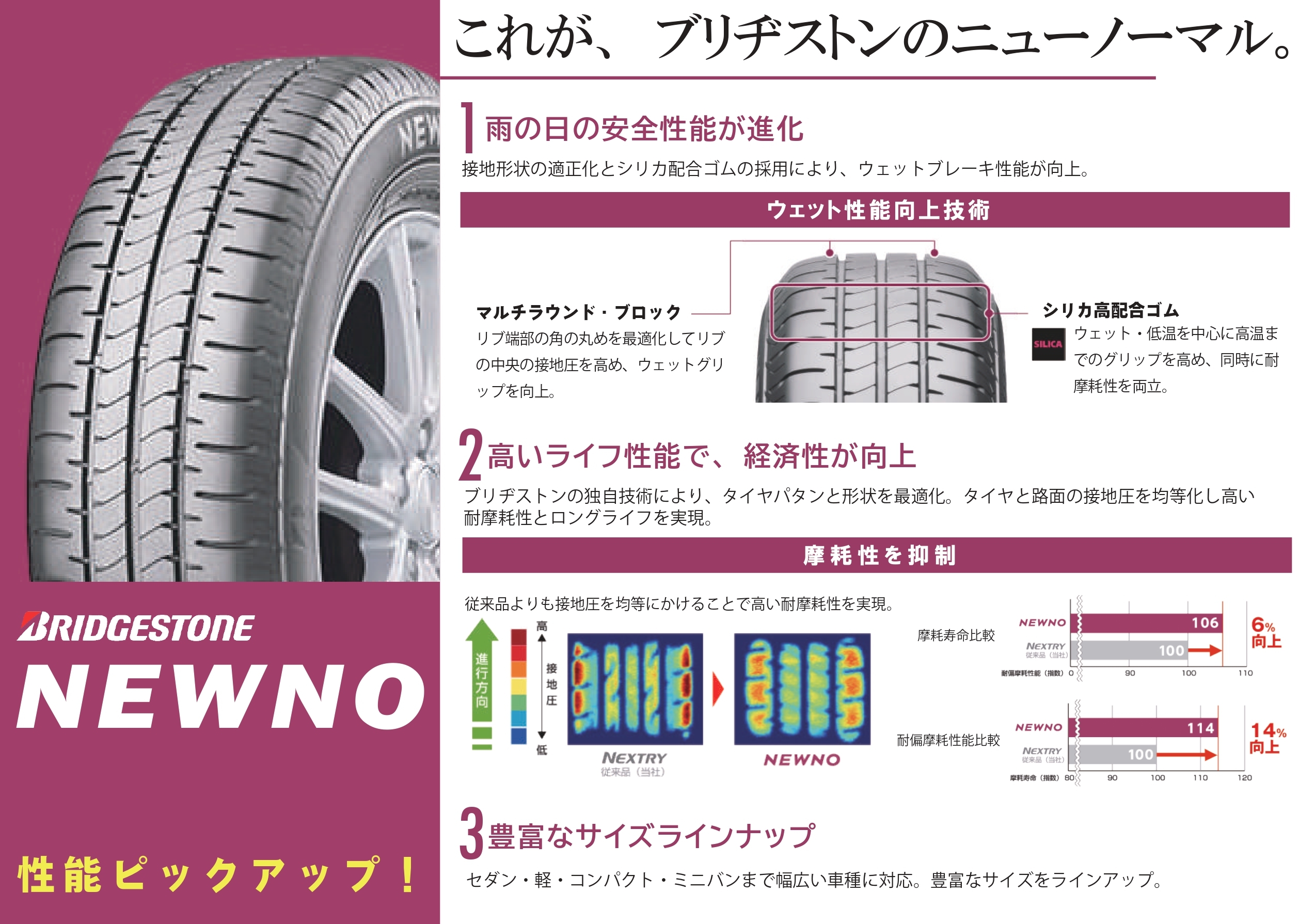 スタンダードモデルタイヤとして必須の燃費性能、ウェット性能、耐久性を持つ