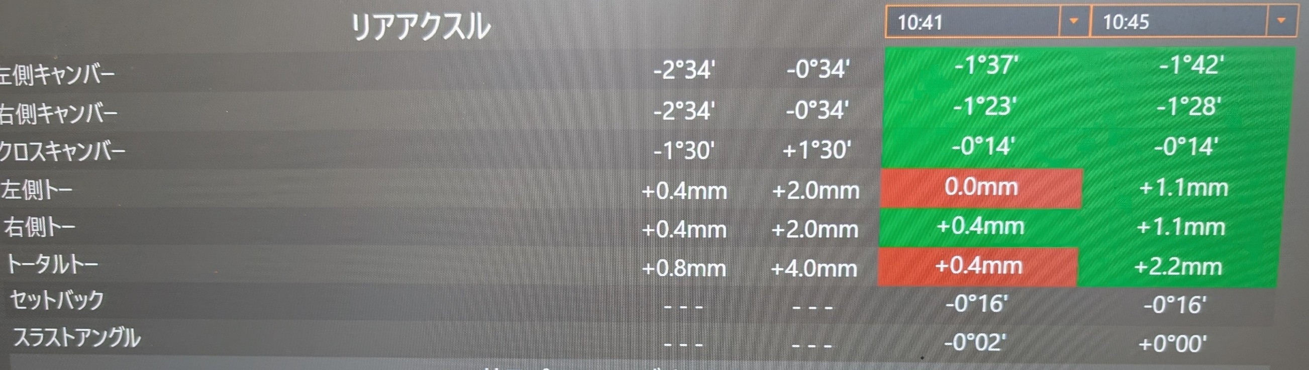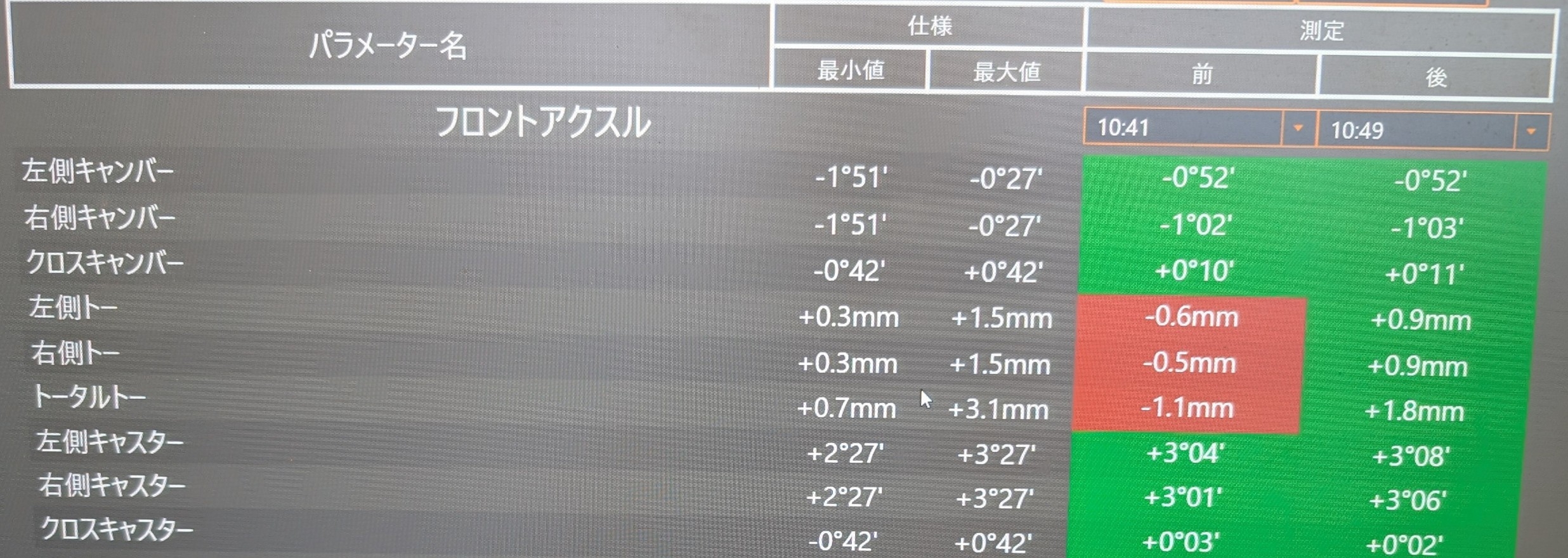 前後トーともに基準値よりも外側に向いている状態でした。