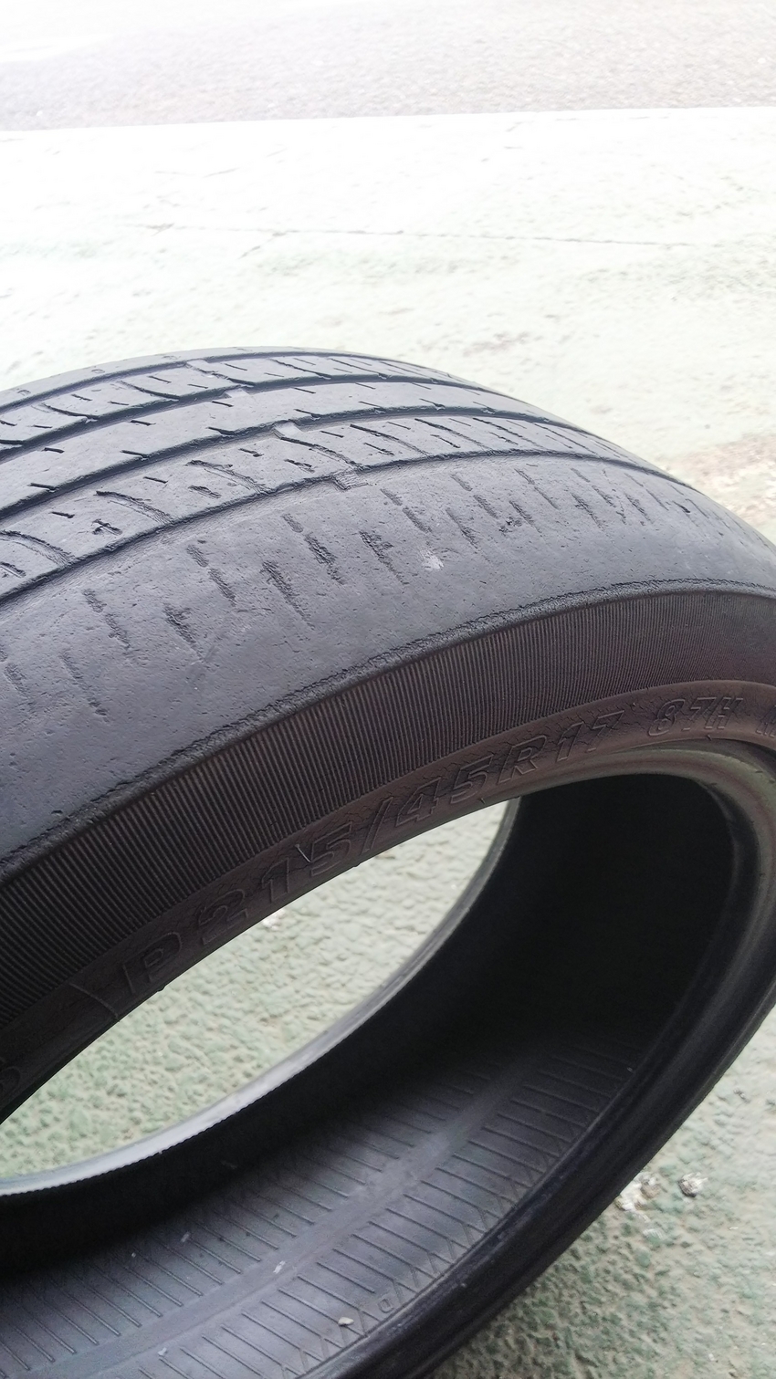 サイズは215/45R17でした。タイヤのショルダー(肩)の部分は丸くなりスリップサインまで乗られていました。