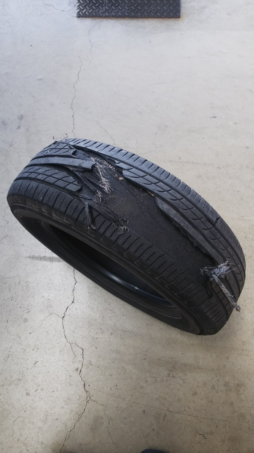 今日は午前中だけで2台タイヤトラブルのお客様が来店されました。1台はパンク。もう1台はバーストです!