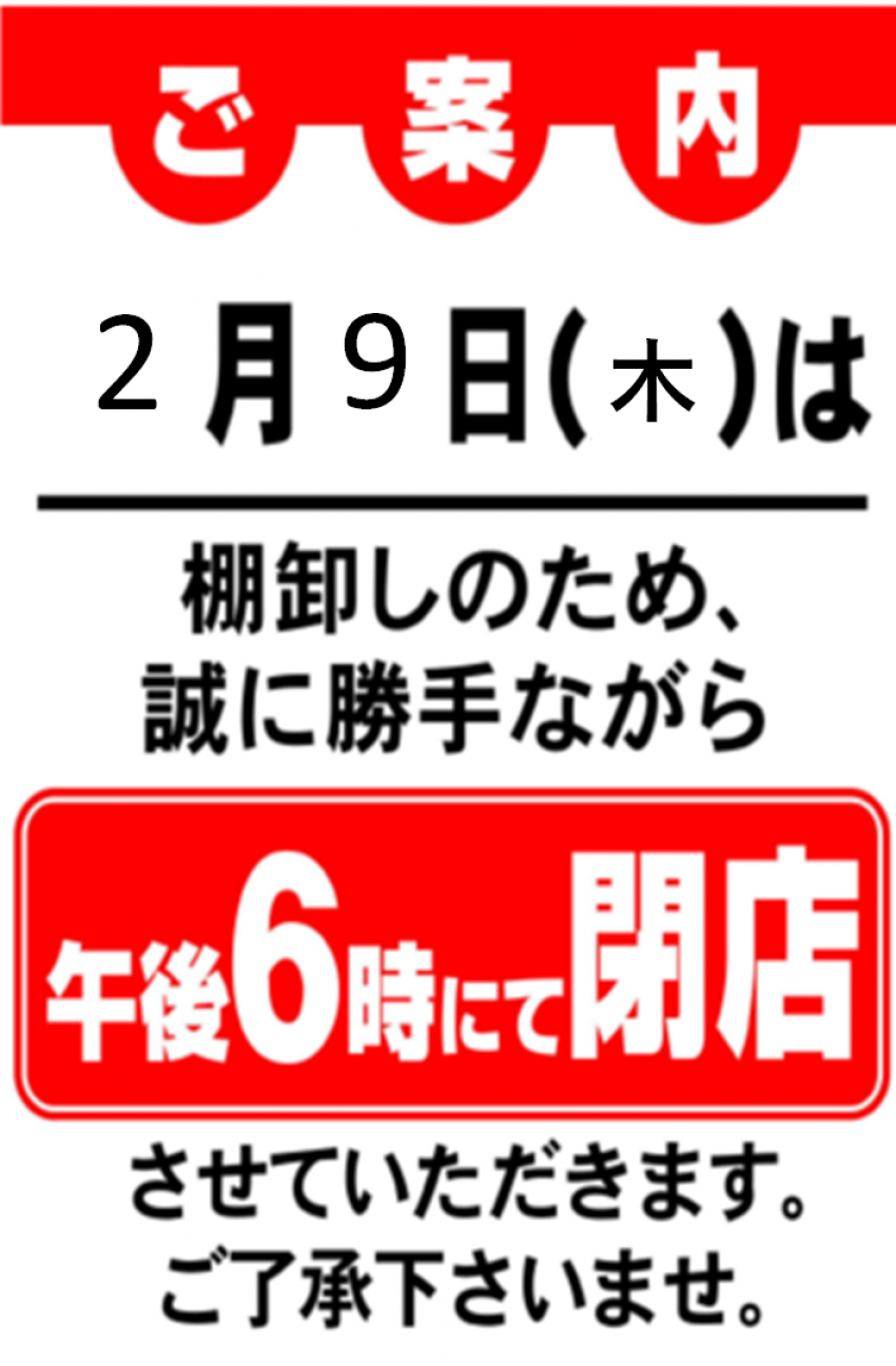 2/9(木)は、棚卸の為、誠に勝手ながら、午後6時にて閉店させていただきますm(_ _)m
