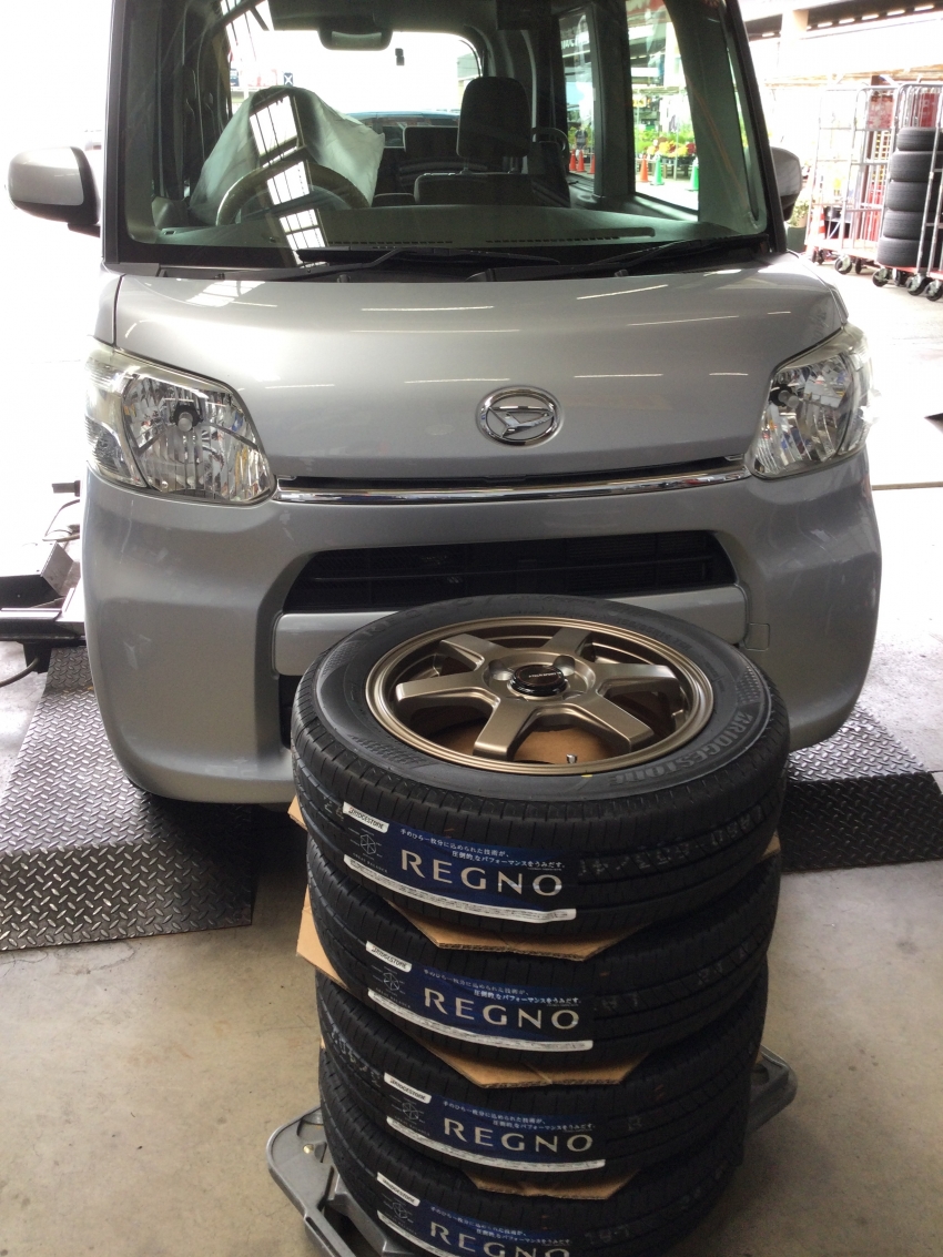 本日は、ダイハツ タント にて、サマータイヤ+アルミホイールのセットをお取付けさせていただきましたので、ご紹介いたします!!