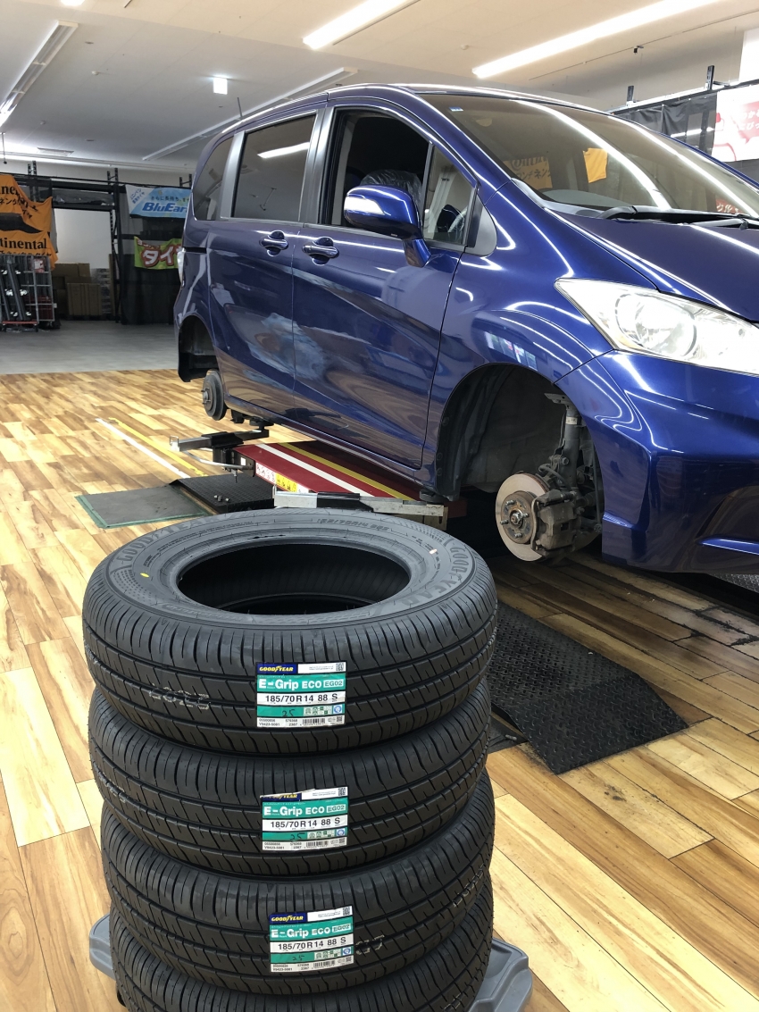 フリードにグッドイヤーの低燃費タイヤを4本お取り付けさせて頂きました(`・ω・´)