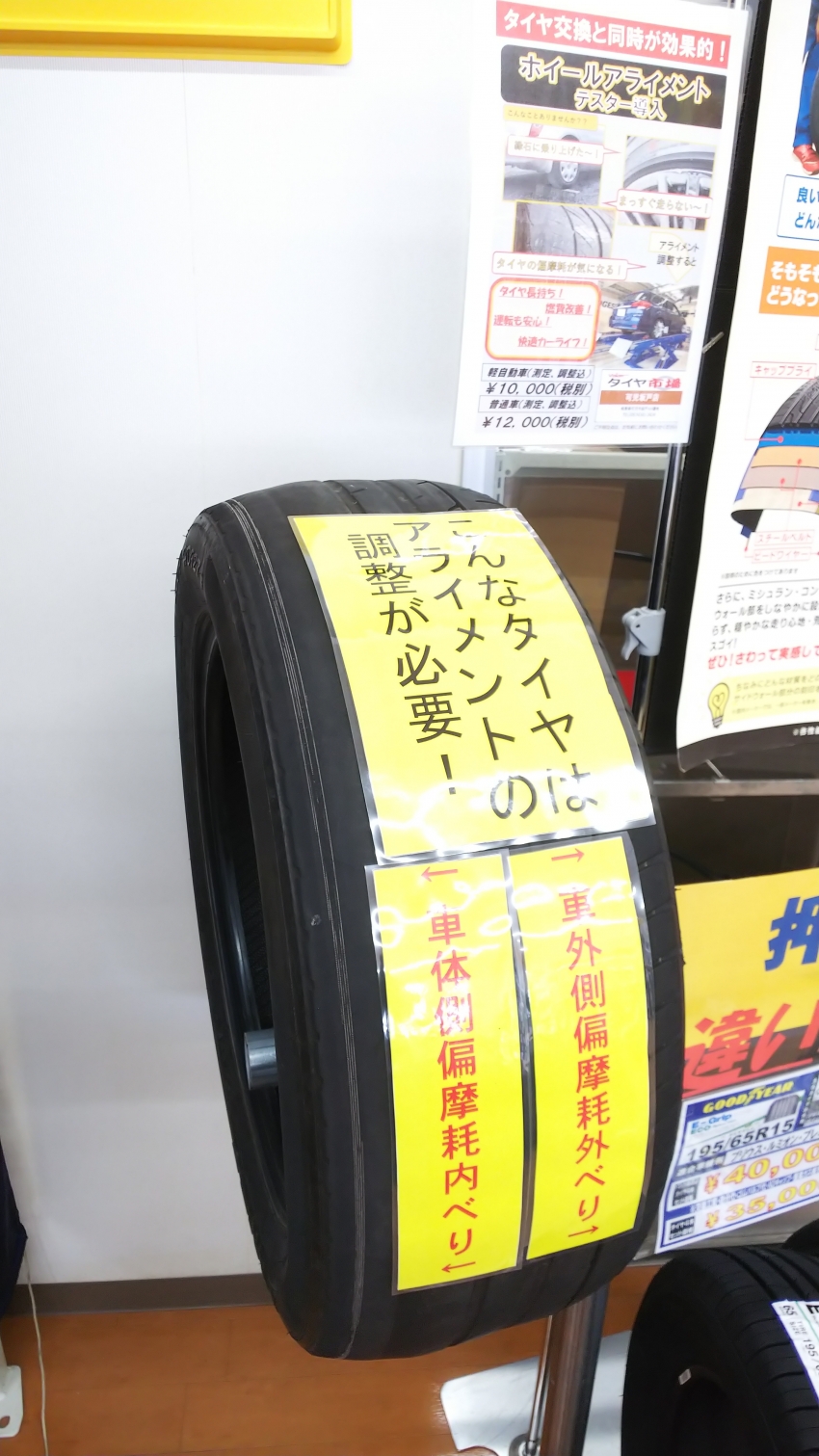 この写真のタイヤのように内側や外側が異常摩耗している