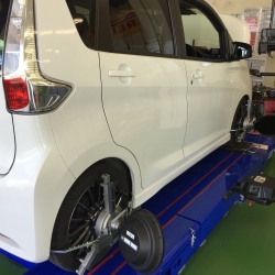 本日、車高を下げたミラカスタムのアライメント調整をおこないました!