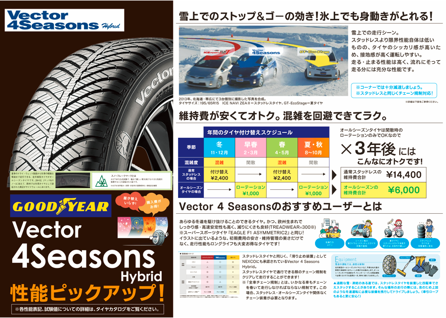 国産のオールシーズンタイヤがアウトレット価格でお買得!!グッドイヤーのベクター4シーズンズ!!フィット・ヴィッツ・ポルテ・デミオ・bBなど【サイズ175/70R14・175/65R14】