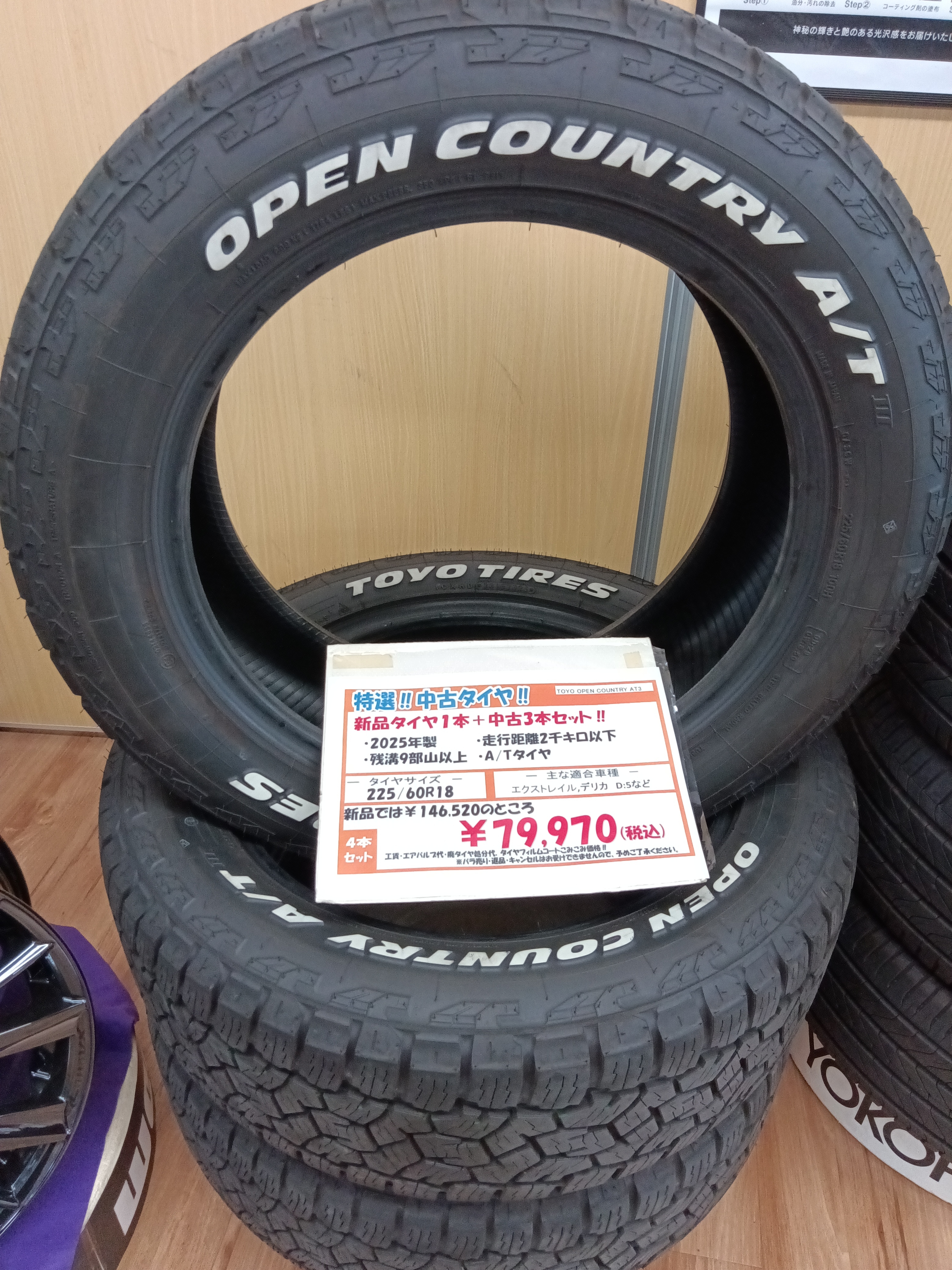 中古のタイヤが3本と新品のタイヤが1本で¥79,970でご案内しています。