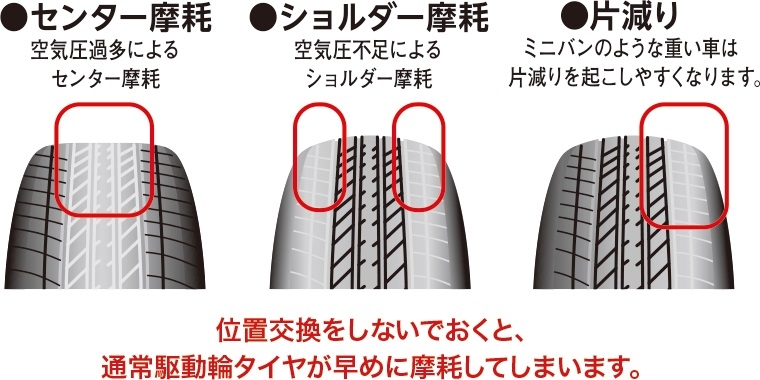 また、ローテーションをしないと・・・異常摩耗の原因になり、様々なトラブルの原因に!