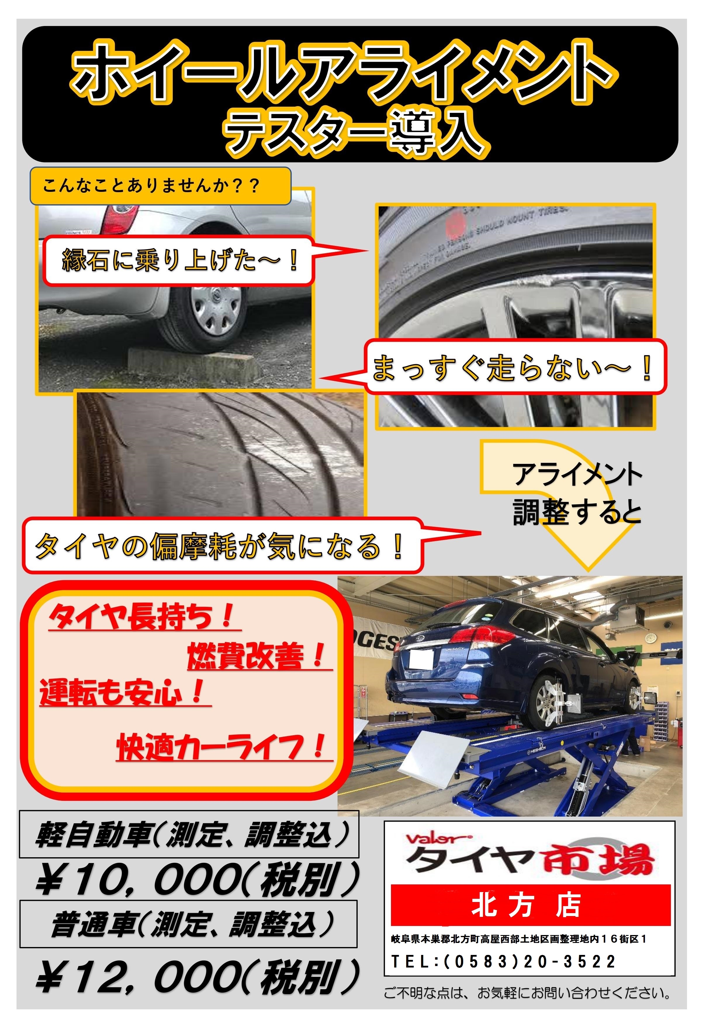 車も一緒でタイヤの取付位置からのズレを修正するのがアライメント調整です。いわば、車の整体ですね。人は体のメンテナンスが必要ですが車も同じで元気に長く大切に使用されるのであれば、定期的にメンテナンスを行う必要があるのです。
