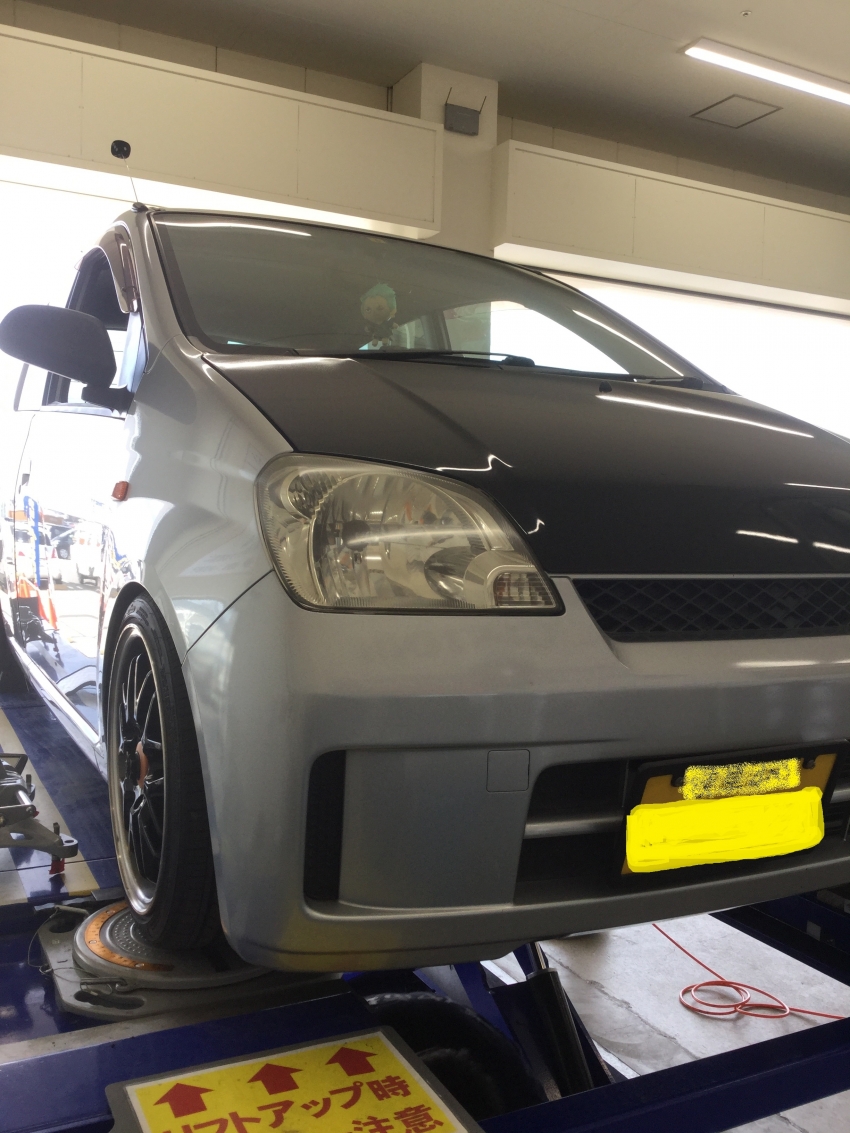 さて、今回のミラは、車高調変えてから、一回もアライメント調整なされておらず、タイヤの偏摩耗が著しいため、調整をご依頼頂きました。