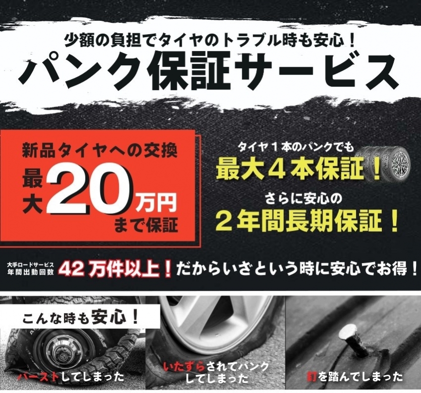 お車への装着作業当日から(組込後お持ち帰りの場合は、お持ち帰り当日から)釘などの異物によるパンク・縁石でのサイドカット・走行中のバースト・イタズラによるパンクに長期の2年間保証いたします