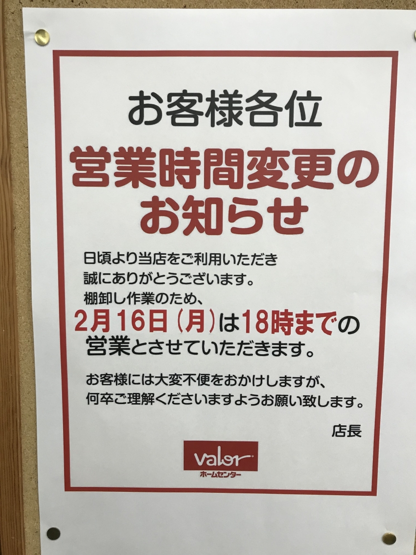 2月16日(月)棚卸に伴う営業時間変更のお知らせ