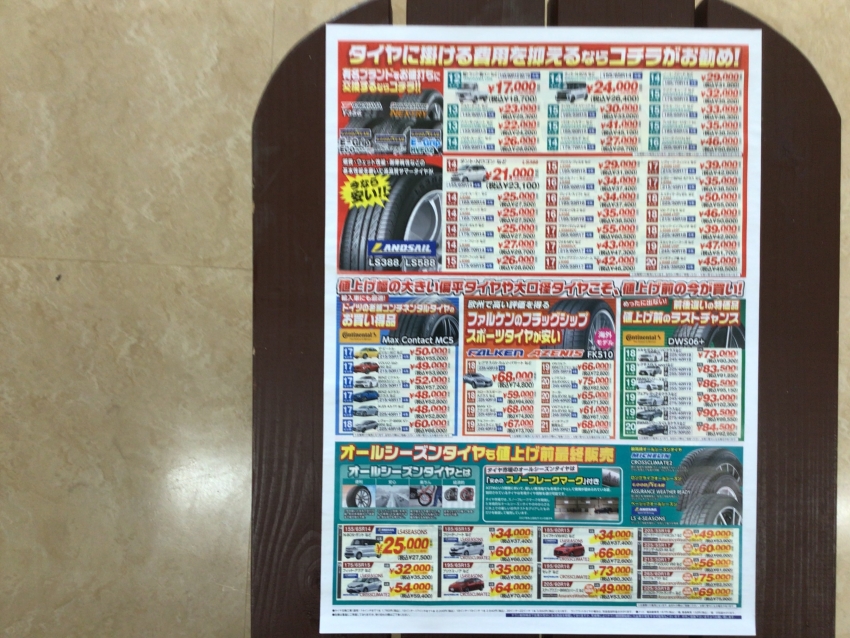 というのも現在タイヤ市場ではPOPの総額表示化を進めており、売場では今までの税抜表示と税込表示が混在しているからなんです。お客様にはご迷惑をおかけいたしますがご了承いただきますようお願いいたします。<m(__)m>