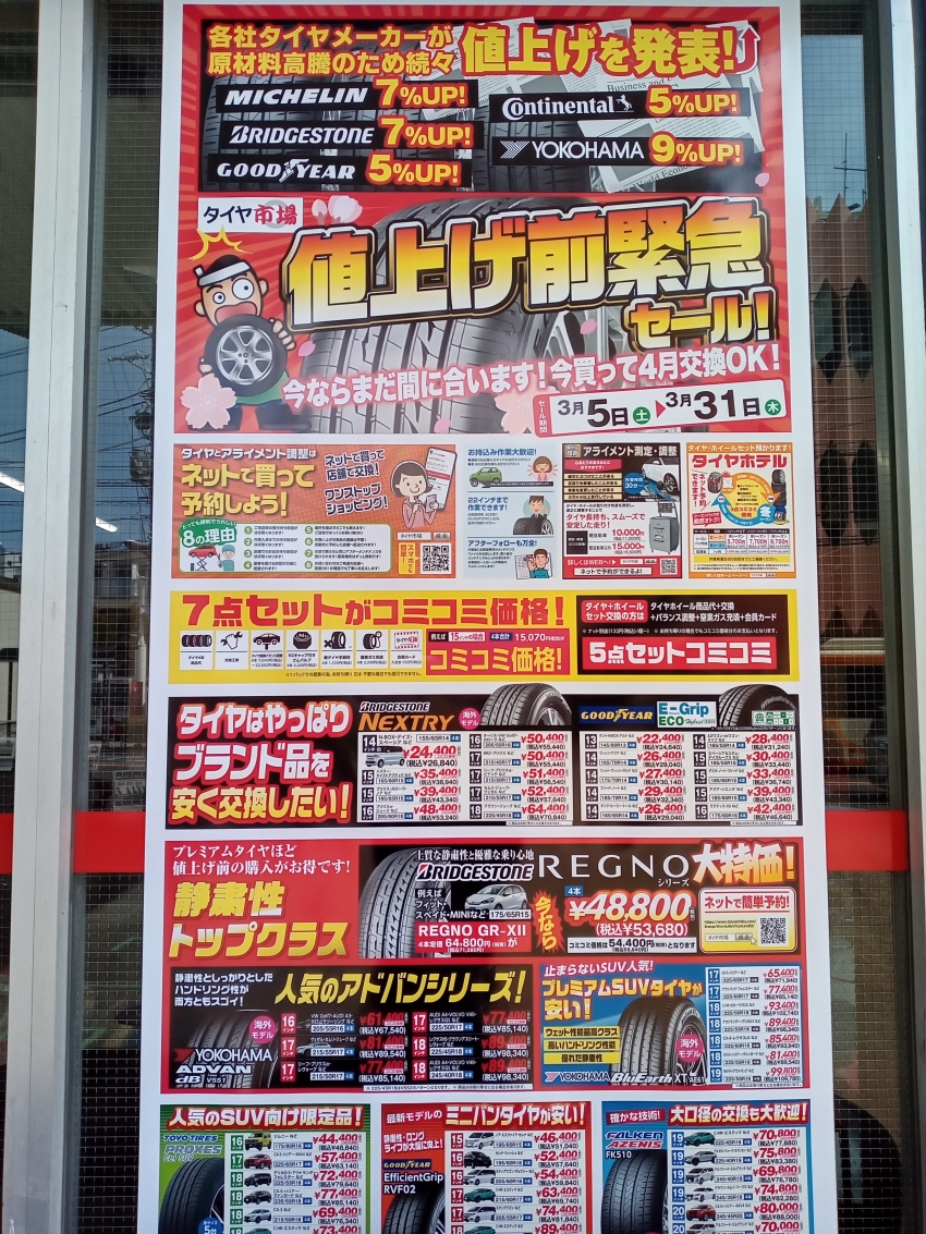 値上げに伴いタイヤ市場江東砂町店では