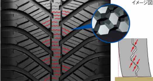 気温変化に強いゴムにより、冬の低温下でもしっかりグリップします。 グリップ性能と、操縦安定性を重視した専用設計の「オールウェザー シリカコンパウンド」が、多彩な路面コンディションで、その威力を発揮します。