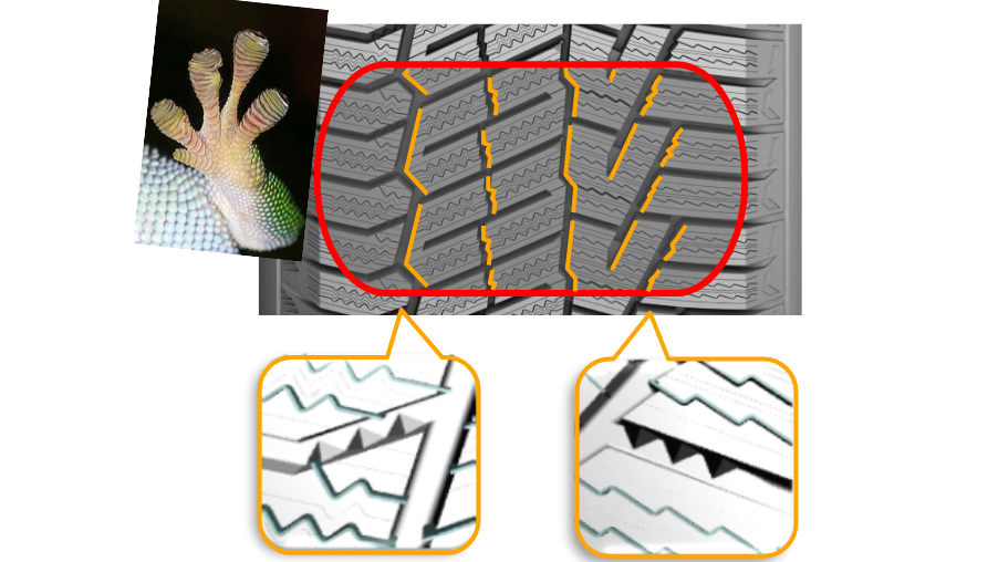 ゲッコー(ヤモリ)が容易にガラスの上を這うことが出来るように、多数の3Dトライアングルエッジが強力なグリップを実現。強いブレーキと登坂力は氷雪路での安全性を発揮します。