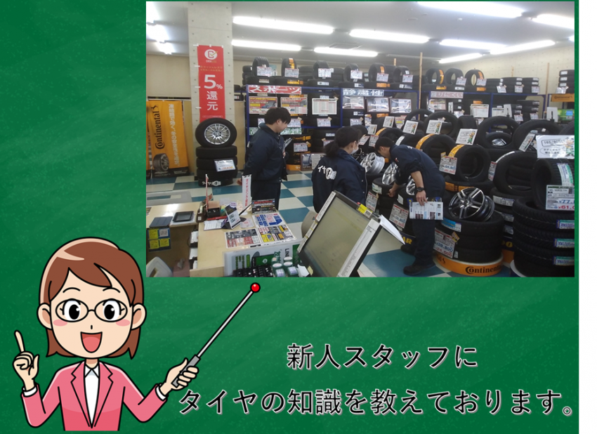 本日は、新人スタッフにタイヤの知識・販売の仕方の