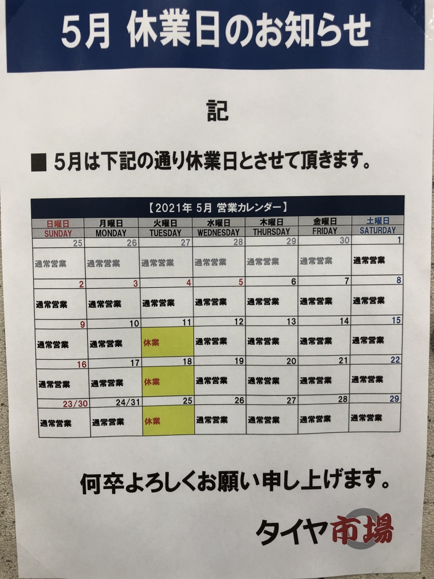 店休日のお知らせ!!