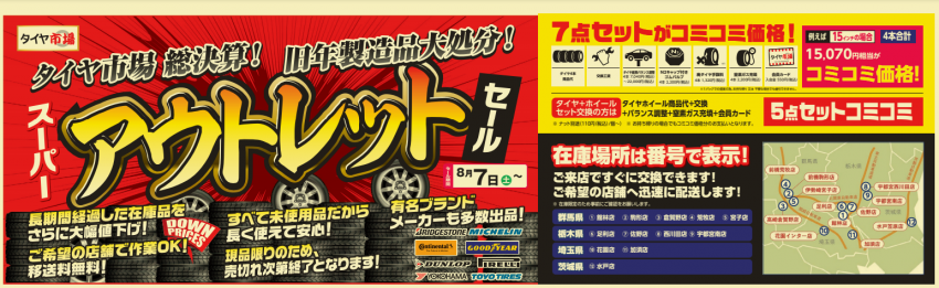 8月7日から、タイヤ市場ではアウトレットセールを実施しています!!