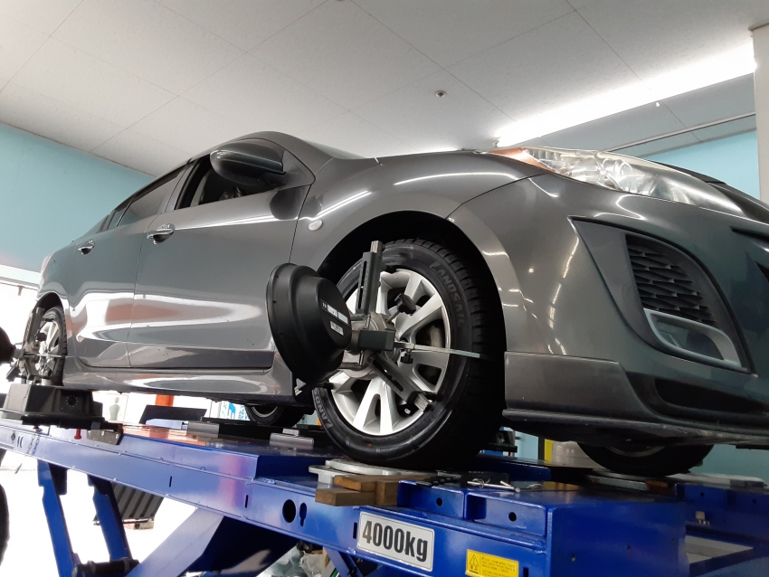 今回はアクセラのホイールアライメント調整を行いました。