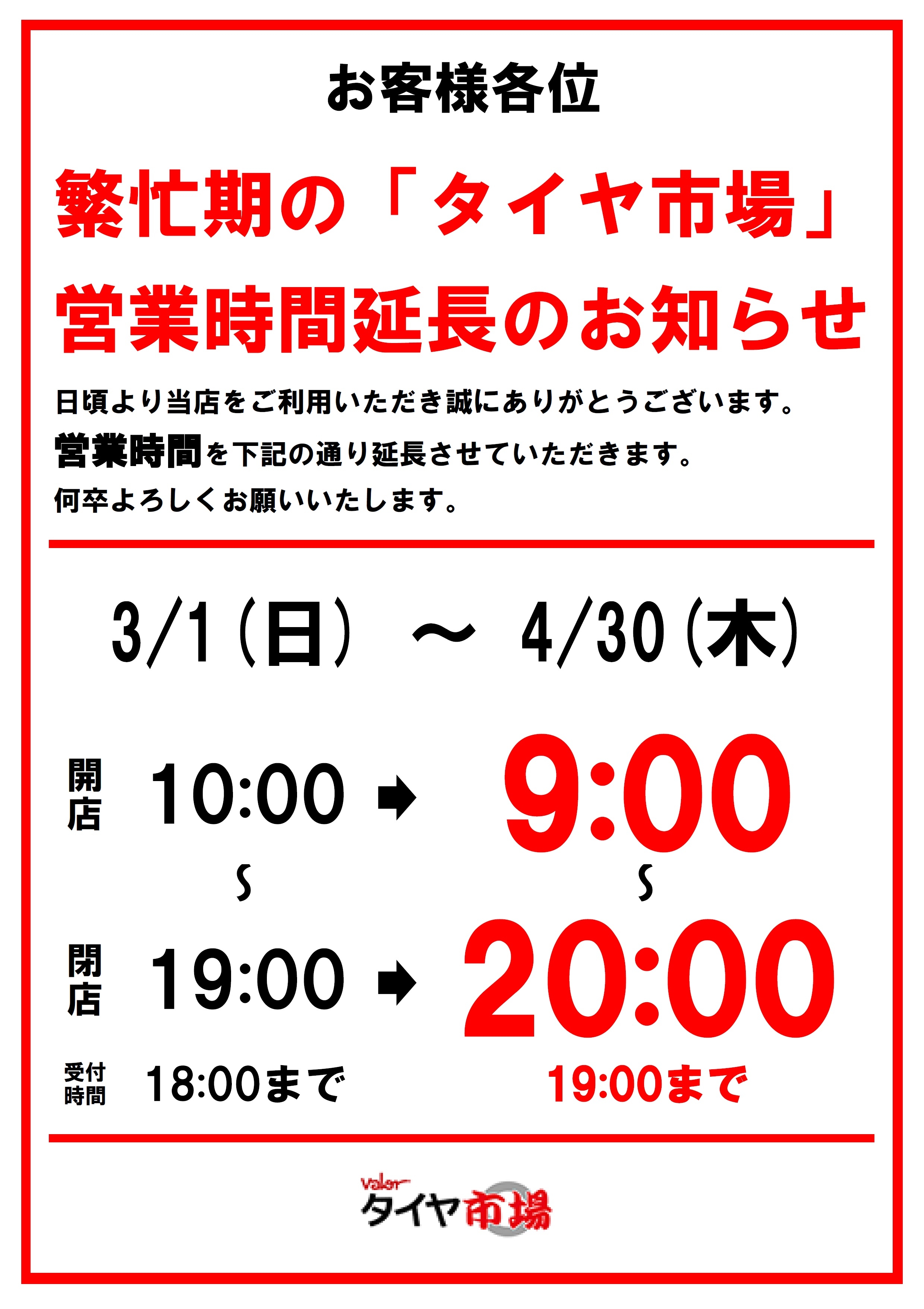 本日より4月末まで営業時間を延長して営業いたします。