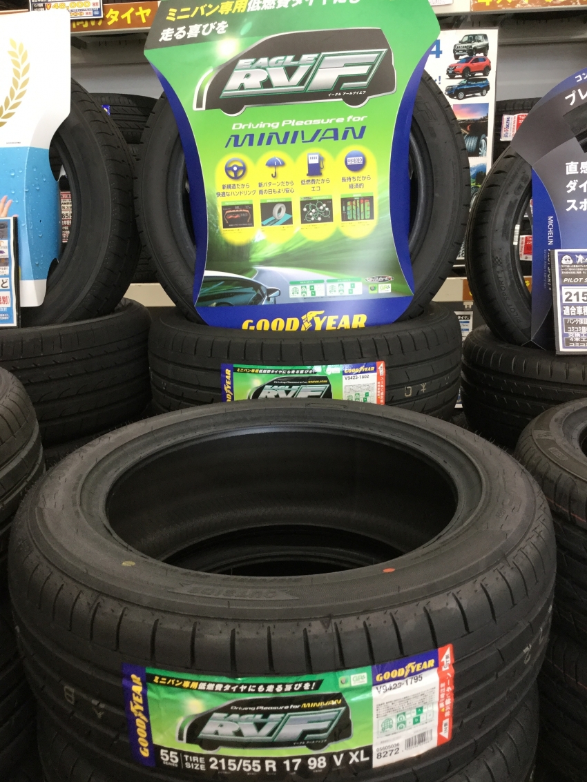 こんにちは、バロータイヤ市場正木店です。今回は、ミニバン専用タイヤ「GOODYEAR RV-F」をご紹介します。 ミニバンの特徴である車高が高く重心位置も高いためコーナーリング時にふらつきを感じやすく特にタイヤ外側ショルダー部への負担がかかりますこの「ふらつき」や「偏摩耗」を制御する左右非対象パターンの設計ですIMG_5642[1].JPG