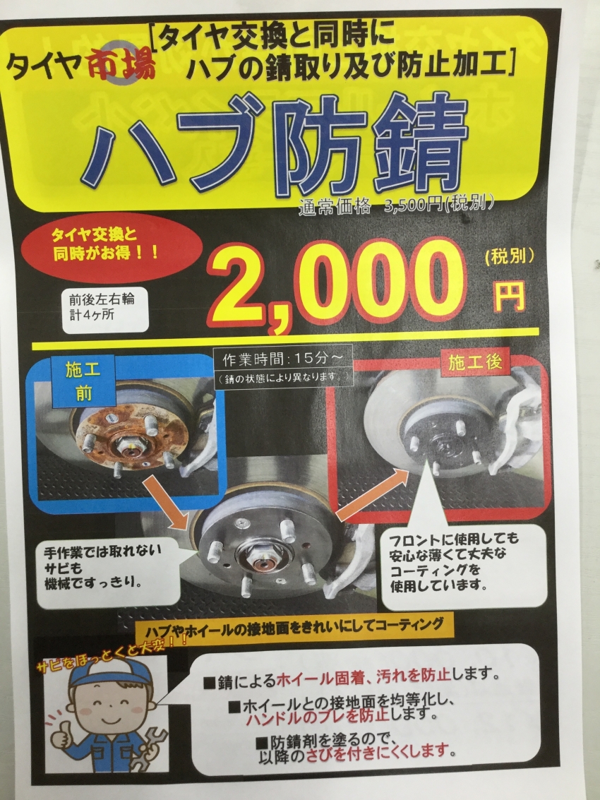 こんにちは、バロータイヤ市場正木店です。 そろそろ夏タイヤから冬タイヤ(スタッドレスタイヤ)への換装時期がやってきました。そこで、タイヤの換装と一緒におススメするのが、「ハブ防錆」作業です。車体とタイヤホイールの接続部の「ハブ」と呼ばれる部分が錆びると最悪脱輪の危険があります。 ・タイヤを外した状態IMG_6729[1].JPG