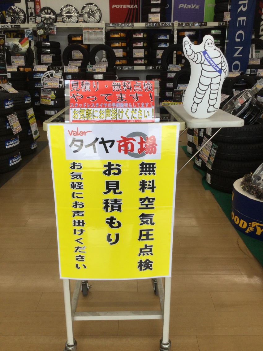 タイヤ市場では、タイヤの点検やお見積りを無料で行っています!