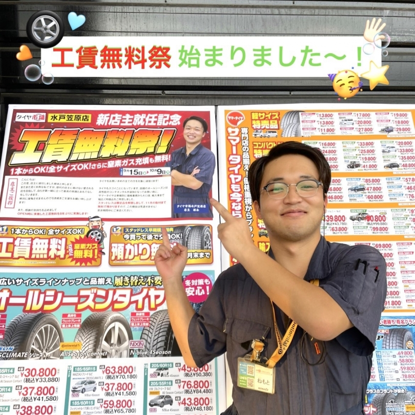 根本新店主就任記念としまして『工賃無料祭』を開催中で~す!!この機会にタイヤ交換しませんか?タイヤのことならタイヤ市場にお任せ!!