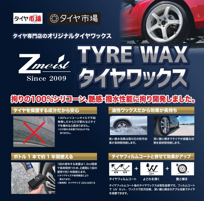 タイヤ市場でタイヤ交換をしたら一緒に「Zmeist タイヤワックス」も一緒にご購入いただければ幸いです。