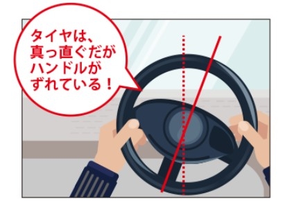 この状態ですとハンドルが真っ直ぐなのにタイヤが左に向いてしまっているの状態になりますので車体が徐々に左に行ってしまいます。