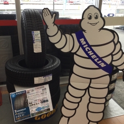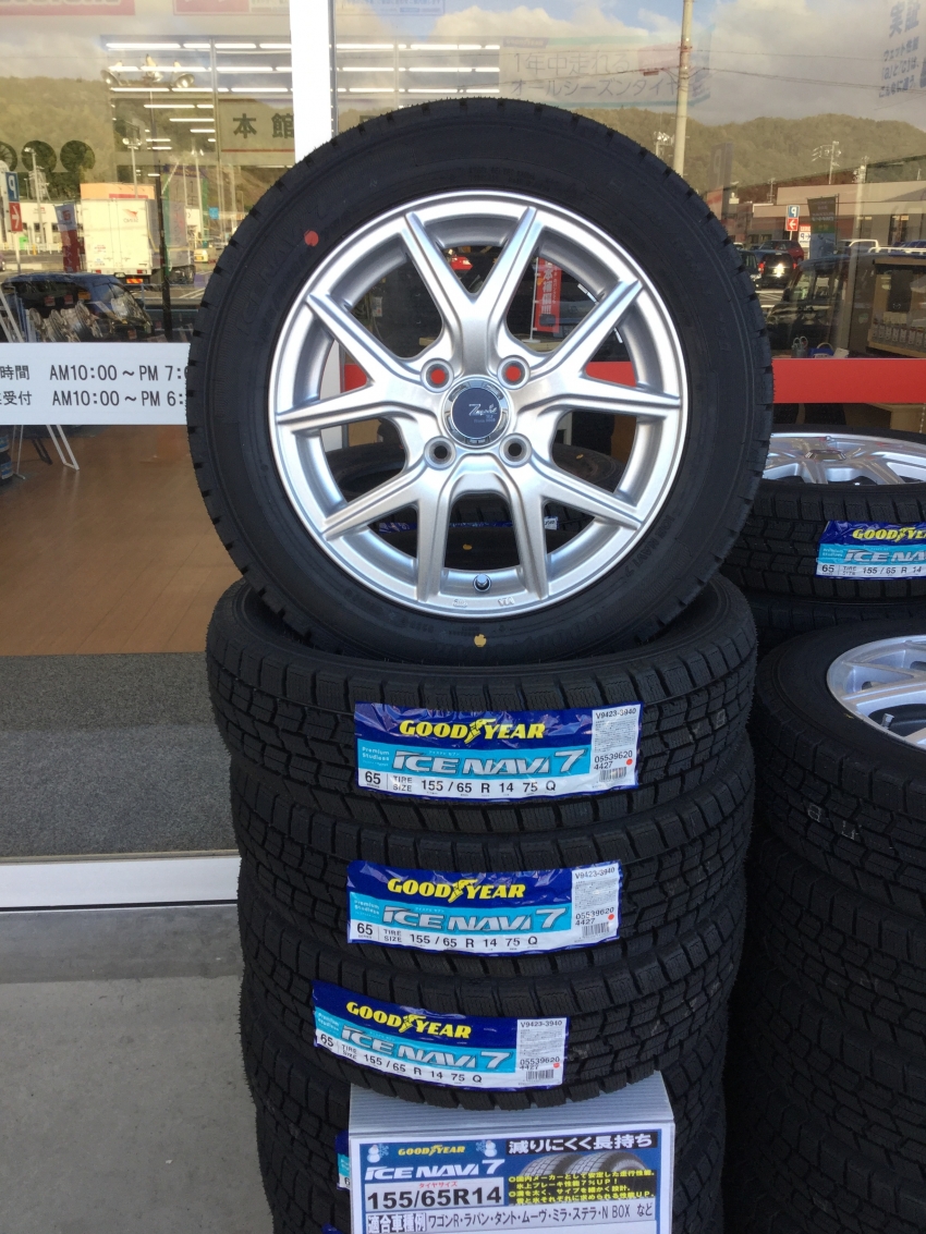 店頭にも各メーカーのスタッドレスが並んでおります。