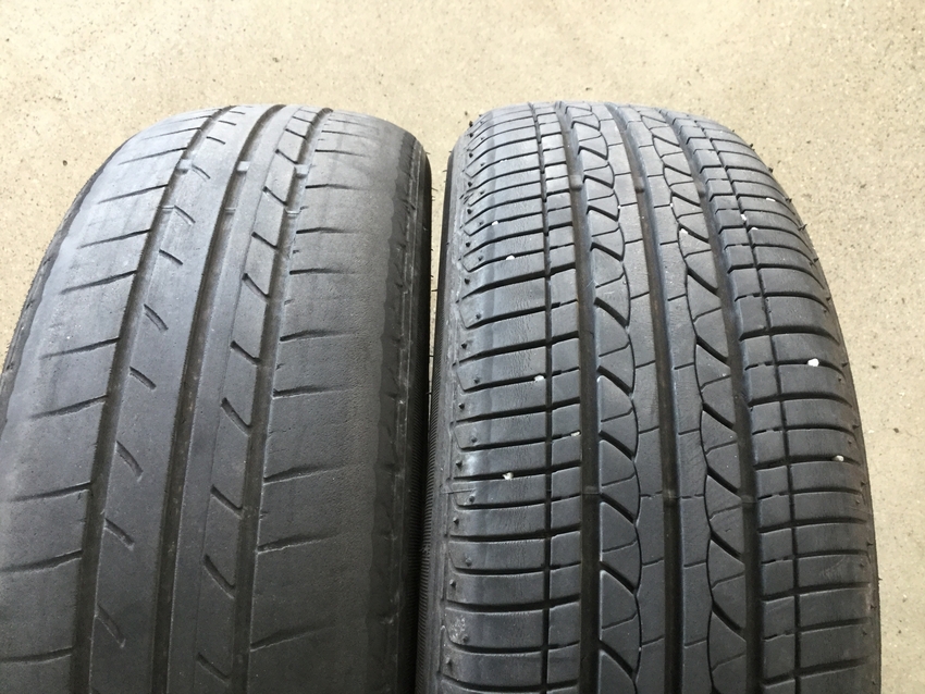 走行距離はわずか2万5000キロ。タイヤは大手国内メーカーの純正装着タイヤでした。あまりにも減り方が違いますよね。でもどちらかが新しいタイヤというわけではありません。4本とも同じセリアル(製造年週)です。