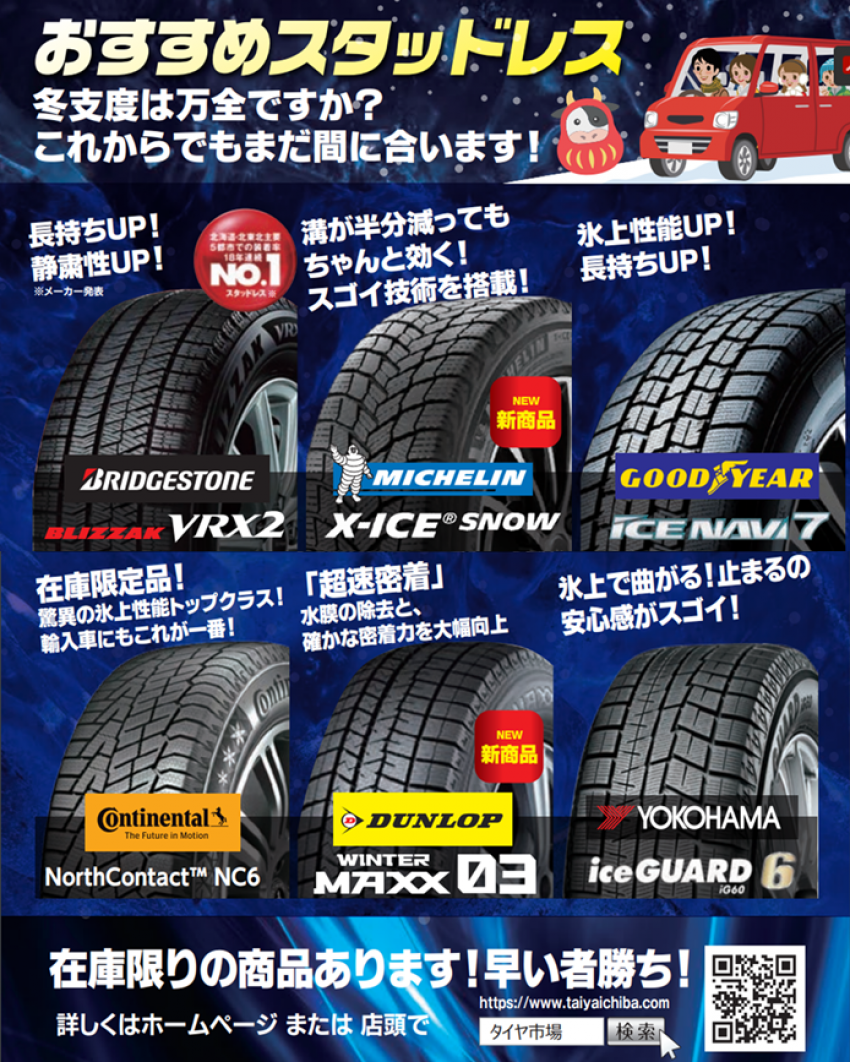 旧年製造 在庫品限りのスタッドレスタイヤ 大特価にてご案内中(完売サイズ・名柄もございます)