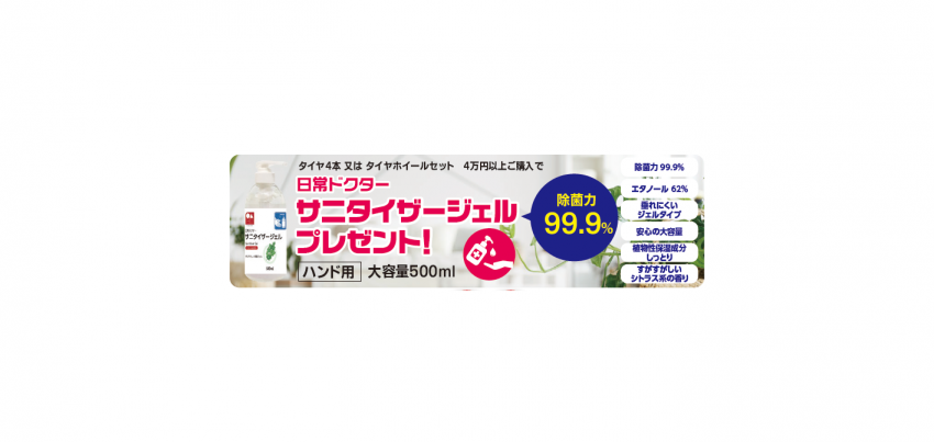 タイヤ又はホイールを4万円(税抜)以上ご購入されたお客様にハンドジェル無料にてプレゼントしています~!!!