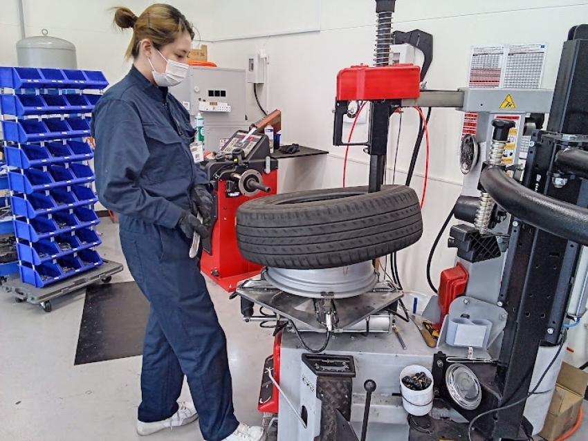 こんな雨の日は作業が少ないので新人の森村さんがタイヤの組み込み練習をしていました!