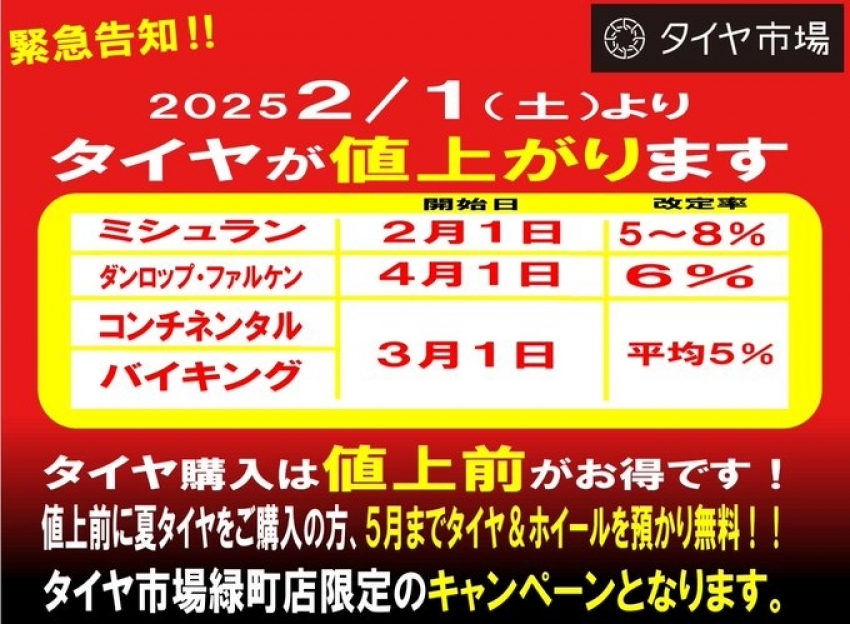 急ですが2025年2月1日に(土)よりタイヤが値上がります!