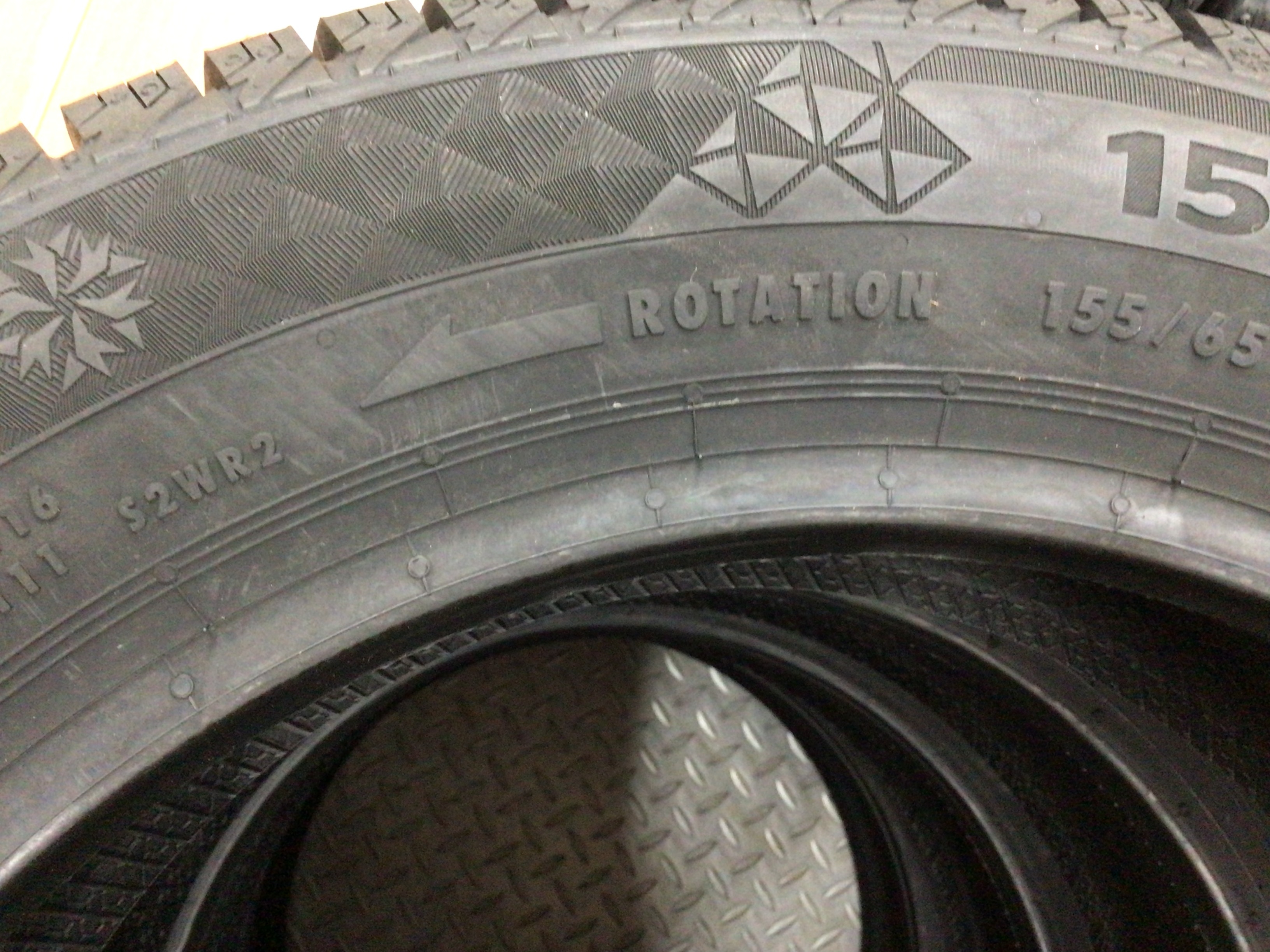 ←ROTATIONとありますが、これはタイヤの回転方向を指示しているマークです。この方向に合わせてタイヤを取り付けないと、本来の性能が発揮できないので注意が必要です。