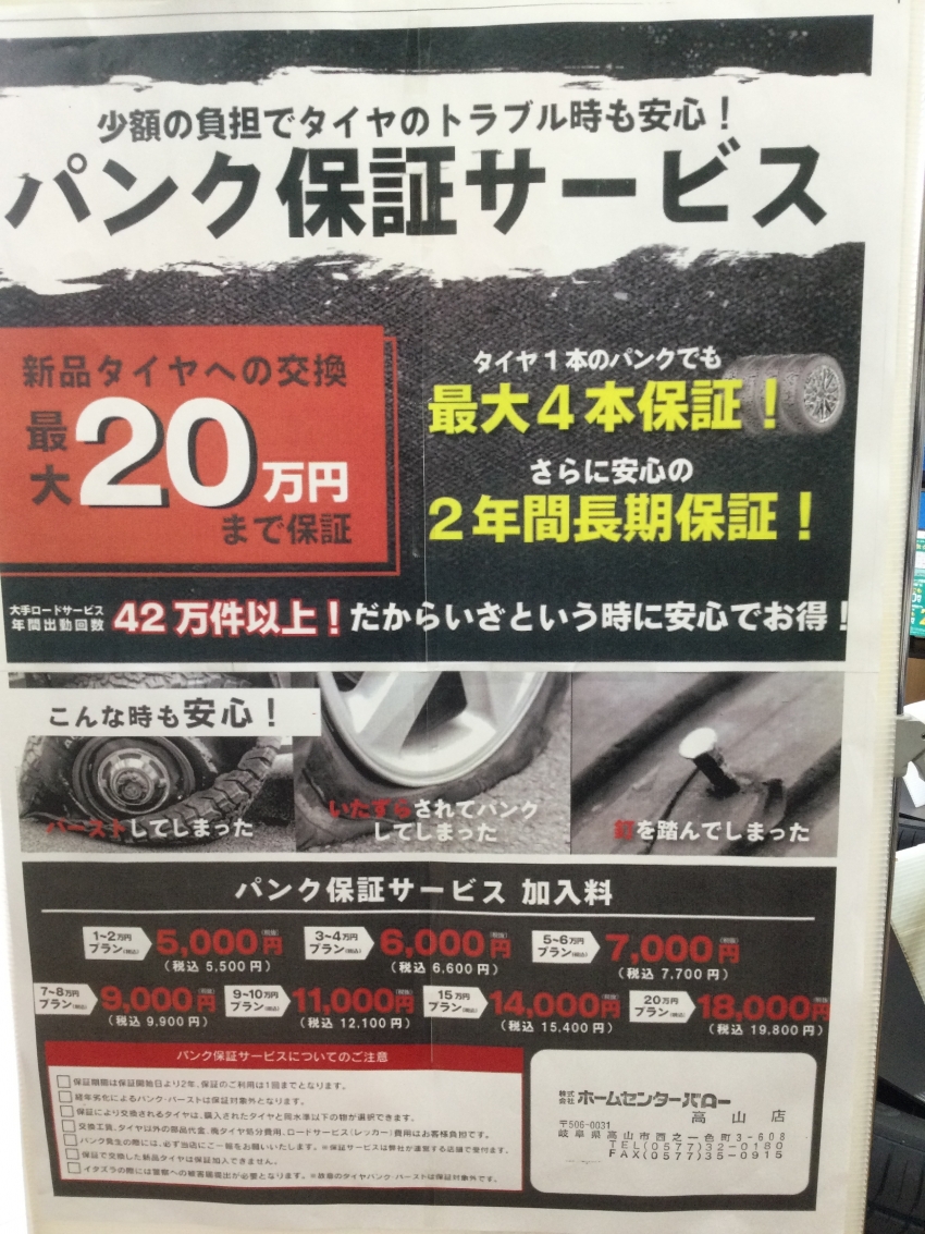 パンク保証に加入しているといざって時に安心ですので、是非新品タイヤ購入時ご検討してみてはいかがでしょうか??