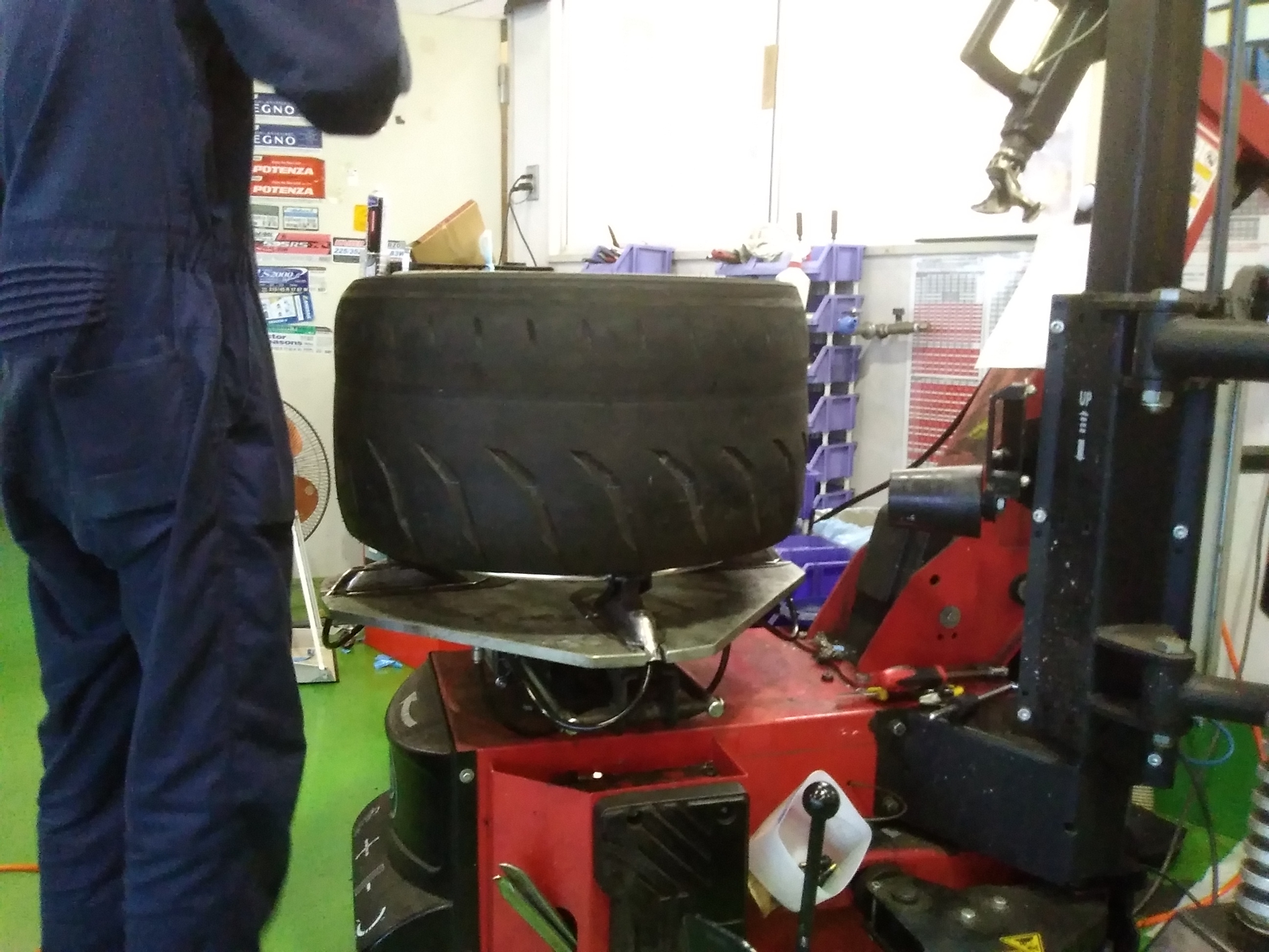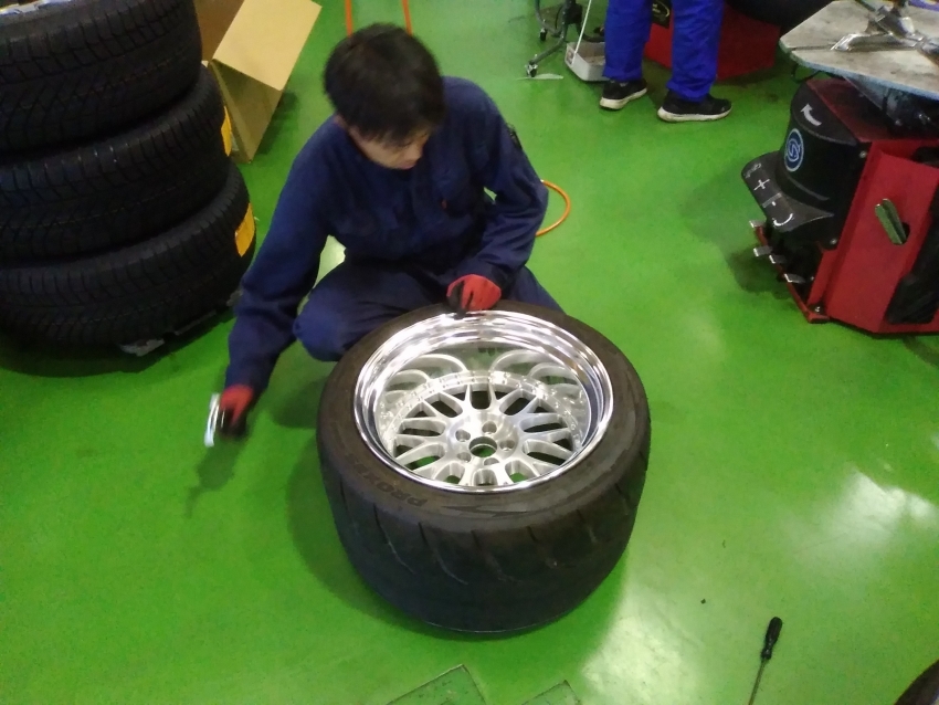 ホイールから一度タイヤを外してin側とout側を反転させて再度組み付ける作業