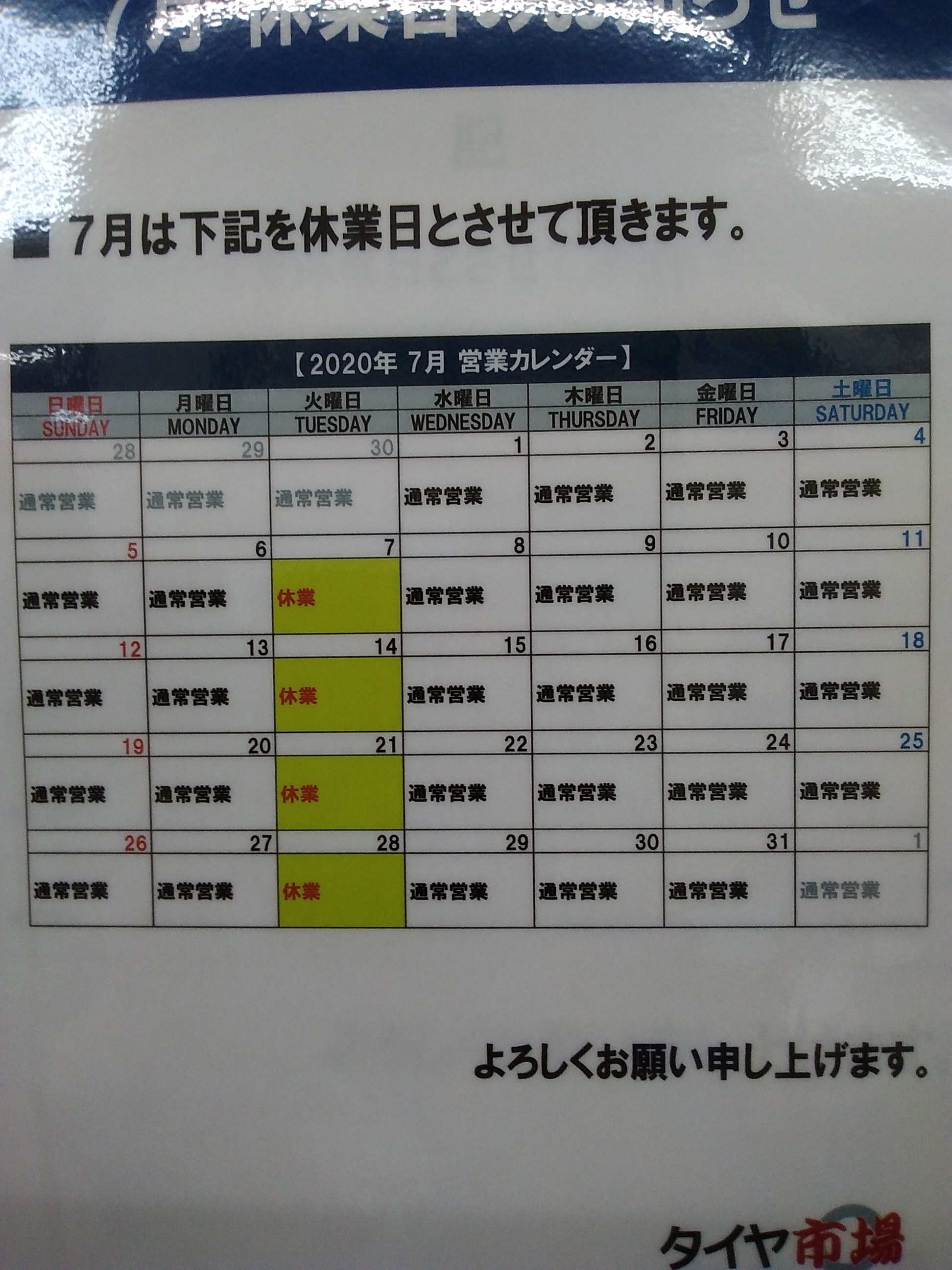 7月の営業日のご案内です