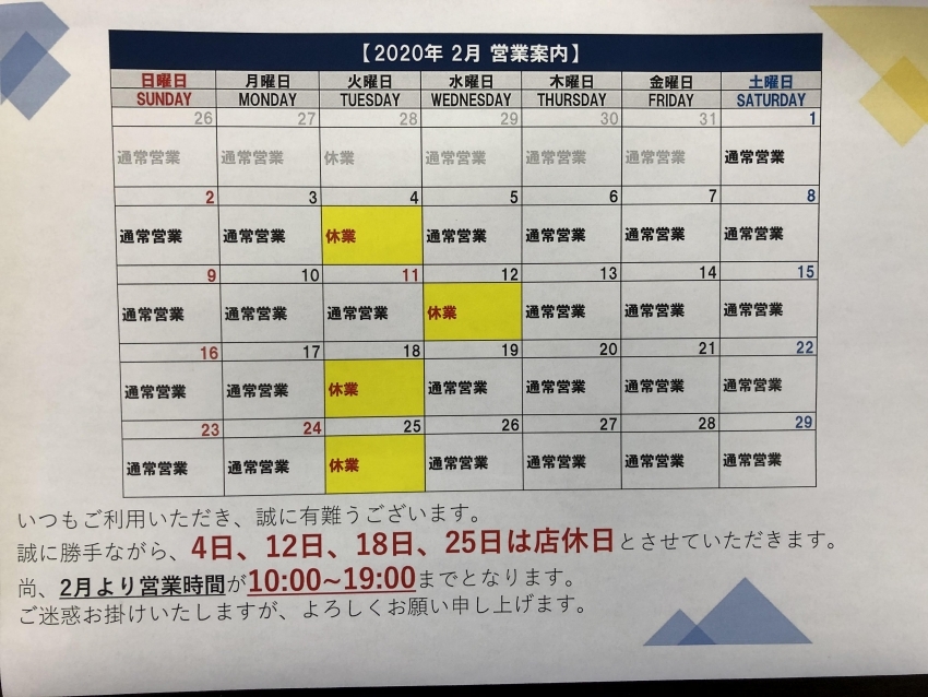 2月営業日のご案内