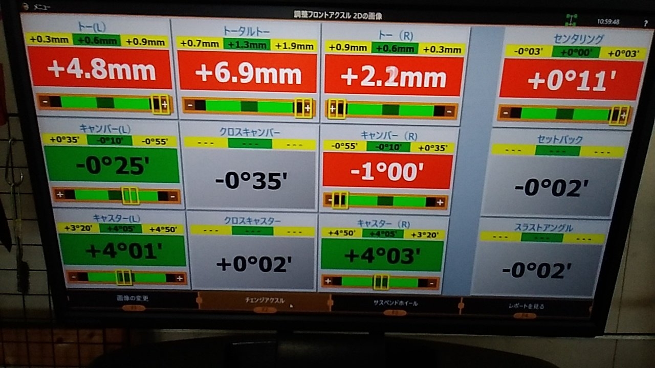 フロントタイヤの外減りがかなり進行している状態でしたので、アライメントの測定を