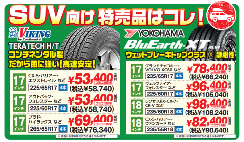 SUVにお手頃価格のタイヤを履かせましょう!