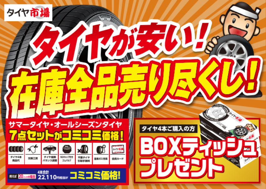 タイヤが安い!在庫全品売り尽くし!【今ならBOXティッシュプレゼント‼】