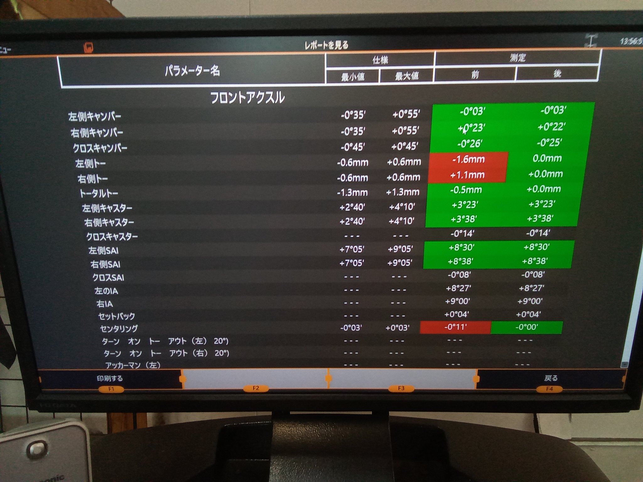 フロント左のトーが1.6mmトーアウト、フロント右のトーが1.1mmトーイン、